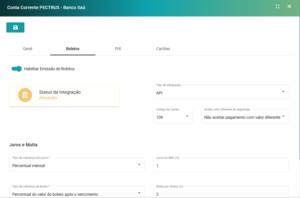 - Tipo da Cobrança dos Juros: Define a maneira como os juros serão cobrados em caso de atraso no pagamento dos boletos. Pode ser configurado para cobrar juros diários, mensais ou de outra forma especificada pelo banco ou política da empresa.