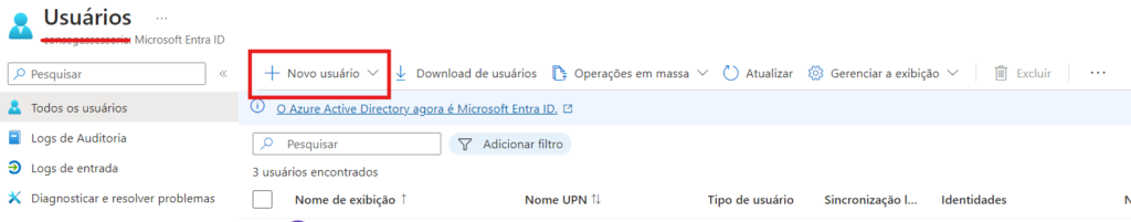 Para acessar o Microsoft Entra, você precisará ter permissão de Administrador no ambiente de sua empresa. Caso você não tenha, peça para que o administrador do Microsoft 365 ou Microsoft Entra da sua organização, crie o usuário no ambiente da sua empresa.