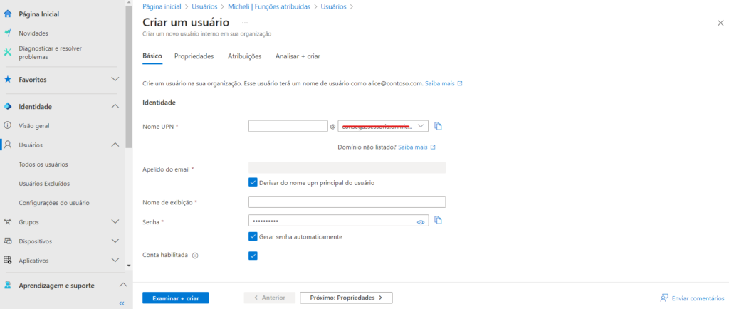 Na aba Atribuições, você pode optar por dar acesso de Administrador no Microsoft Entra para o novo usuário (não recomendado, apenas para usuários que realmente irão administrar a criação e exclusão de usuários da sua organização)