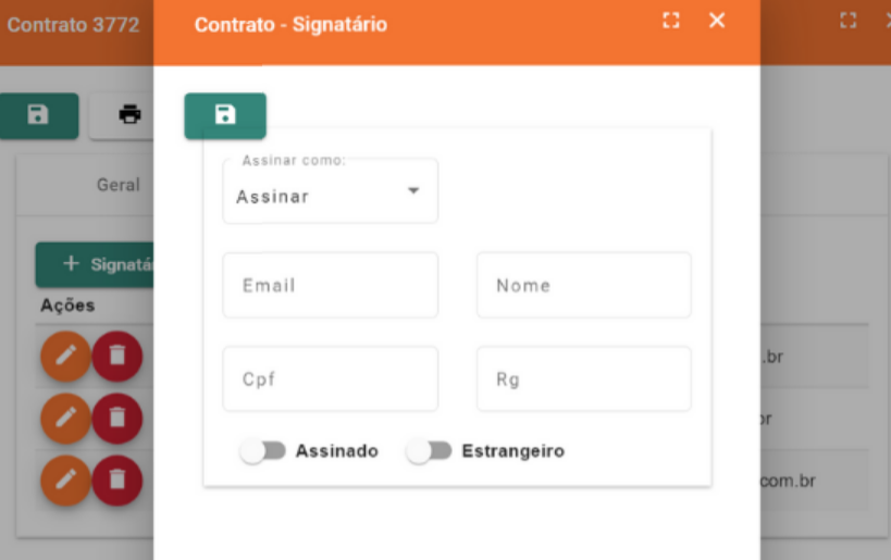 Dentro das configurações de um contrato ou de um template de contrato, existe a opção de cadastrar Signatários.