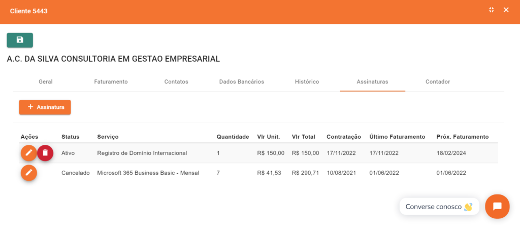 Ao entrar no Cliente desejado, acesse a aba Assinaturas. Nessa aba serão listadas todas as assinaturas desse Cliente e também é possível editar uma assinatura existente ou criar uma nova.