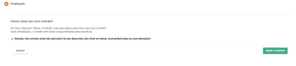 A aba de Finalização do processo de Criação de Contratos serve para concluir e salvar o contrato criado. Nessa etapa, você deve clicar no botão “Salvar o Contrato” para que o contrato seja gerado.