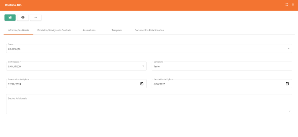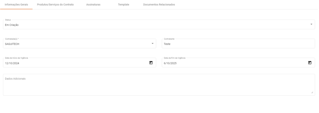 - Dados Adicionais: Campo destinado a informações extras ou complementares relevantes para o Contrato, como cláusulas especiais, observações importantes ou informações suplementares que não se enquadram nos campos pré-definidos.