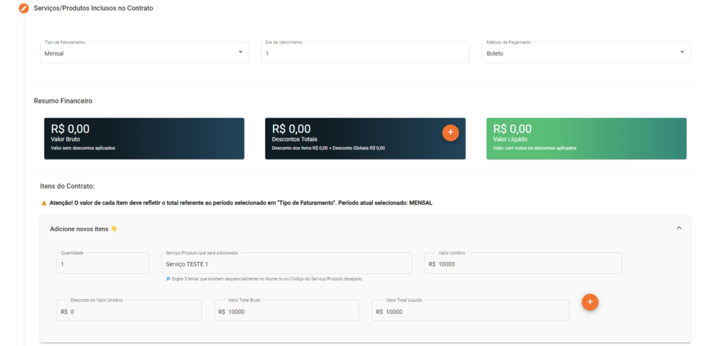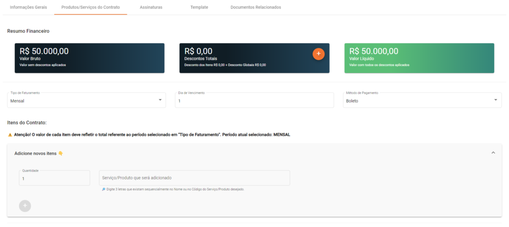Nessa passo você irá configurar o Faturamento e adicionar os Produtos/Serviços e suas respectivas Quantidades, referentes ao Contrato: