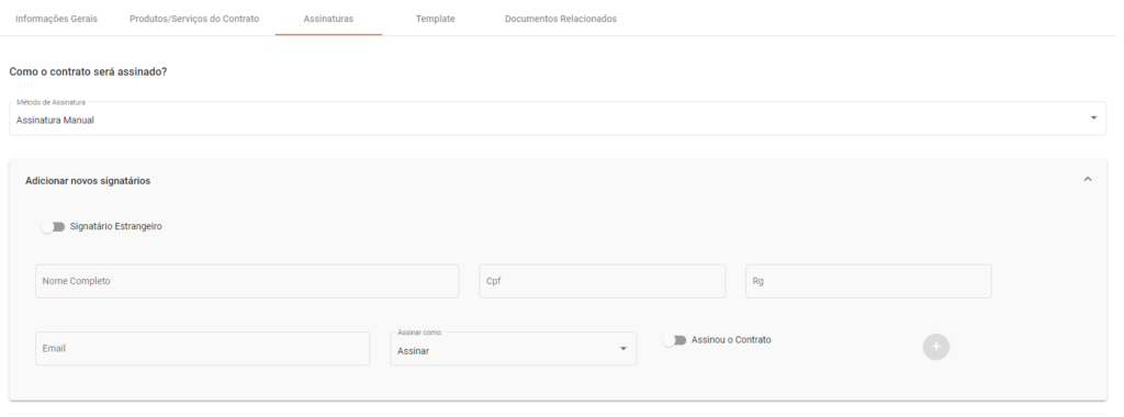 - Método de Assinatura: Define como o contrato será assinado, podendo ser manualmente ou via uma integração com a plataforma de assinatura digital D4sign;