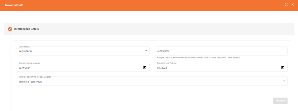 - Template de Contrato que será utilizado: Seleciona o modelo de Contrato padronizado a ser usado na criação do novo contrato, garantindo consistência nas informações e estrutura.
