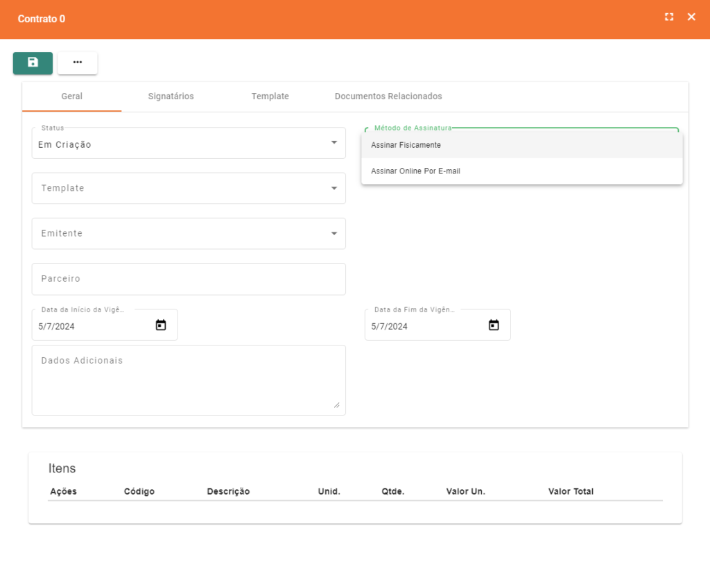 Ao iniciar o processo de criação de Contrato, você deverá selecionar o “Método de Assinatura”, a partir da aí, cada método segue um caminho diferente;