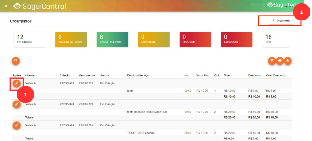 Para editar filtre o orçamento desejado e clique no botão com símbolo de lápis do lado esquerdo do orçamento.