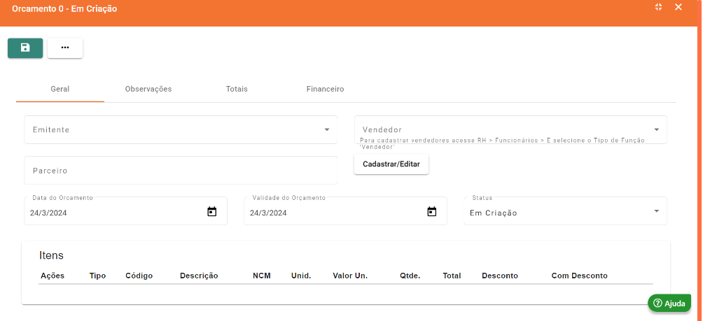 ⚠️ Caso o orçamento tenha sido gerado a partir de uma Oportunidade do CRM, os campos Emitente, Vendedor e Parceiro já virão preenchidos.