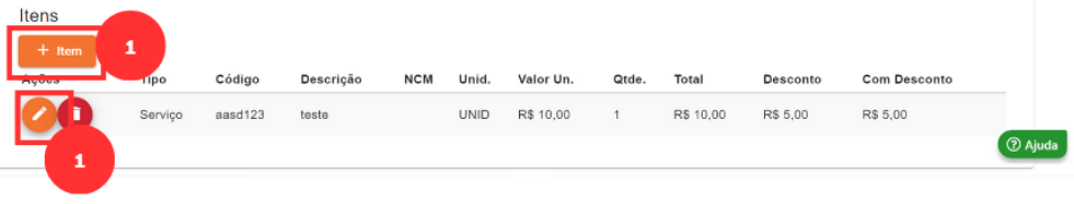 - Para editar um item existente clique no botão de lápis localizado no canto esquerdo do item na tabela;