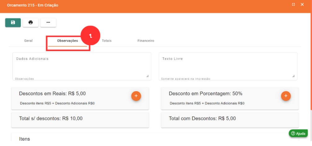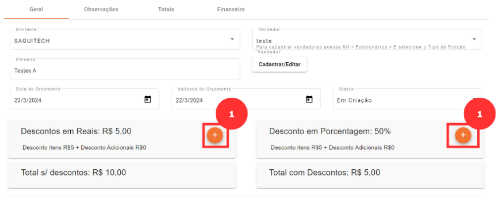 Na primeira aba do orçamento existem dois cartões com os descritivos dos descontos. Clique no símbolo de + de qualquer um deles para poder editar ou adicionar esse desconto geral