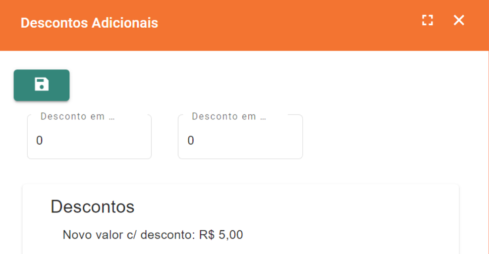 Ao preencher com o valor de desconto, seja em reais ou em porcentagem, o campo não preenchido será atualizado. Por exemplo, se eu inserir um desconto de 13% no Desconto em Porcentagem, ele automaticamente irá preencher o campo Desconto em Reais com o valor em Reais que compreende essa porcentagem de desconto.