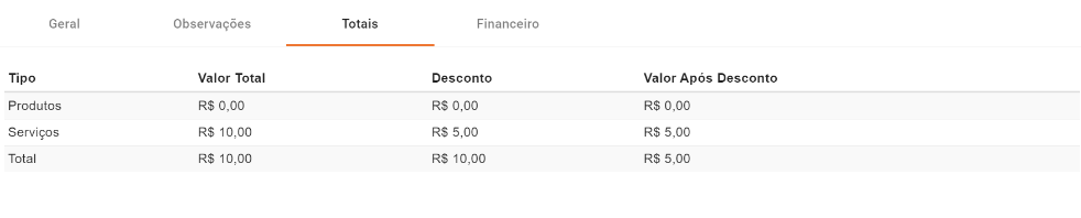 Na aba Totais é possível verificar um resumo com a soma de todos os produtos e todos os serviços que compõem esse orçamento