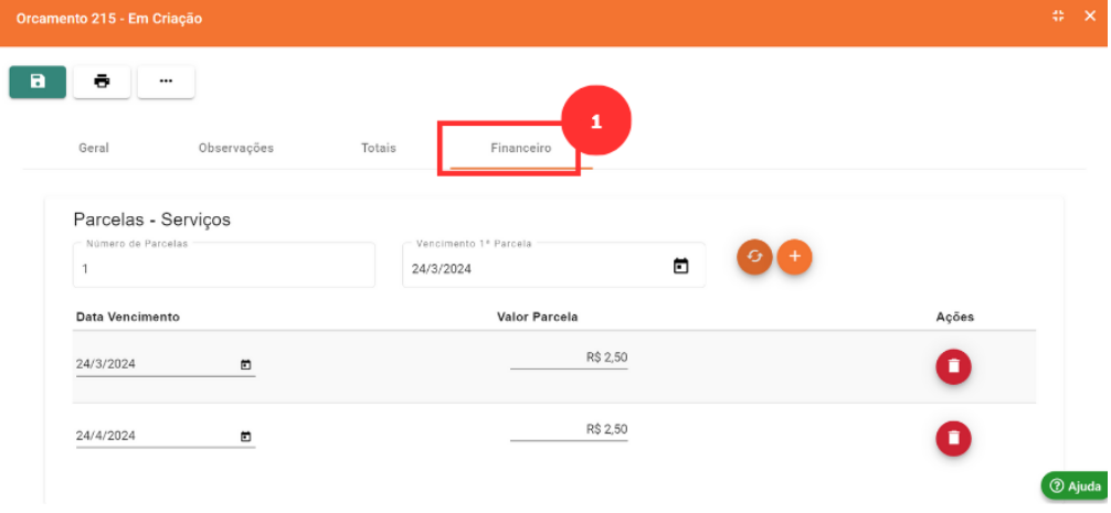Adicione, edite ou exclua parcelas, de acordo com o que foi negociado com o cliente. Para saber mais como criar e atualizar parcelas financeira, acesse o artigo: Criar e Editar Parcelas Financeiras