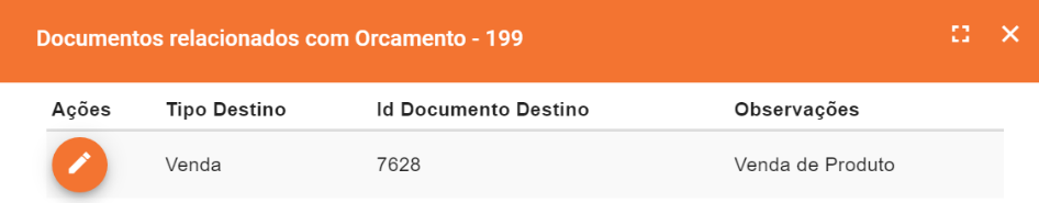 - Documentos Relacionados: Irá mostrar todos os artefatos gerados a partir desse orçamento. Como no exemplo abaixo, onde foi gerado um pedido de venda a partir do orçamento e agora o pedido de venda consta como documento relacionado do orçamento.