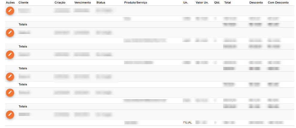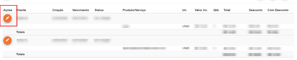 Ainda na tabela de visualização, cada orçamento listado possui um botão com o ícone de um lápis do seu lado esquerdo.
