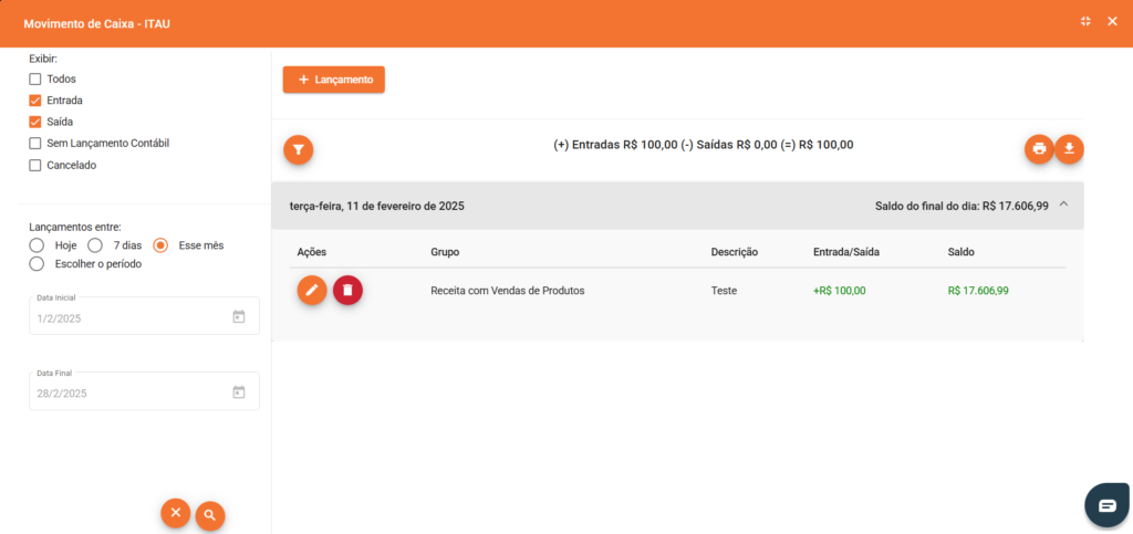 - Lançamento – Representa uma nova entrada ou saída de dinheiro, como recebimentos de clientes, pagamentos de fornecedores ou outras despesas e receitas.