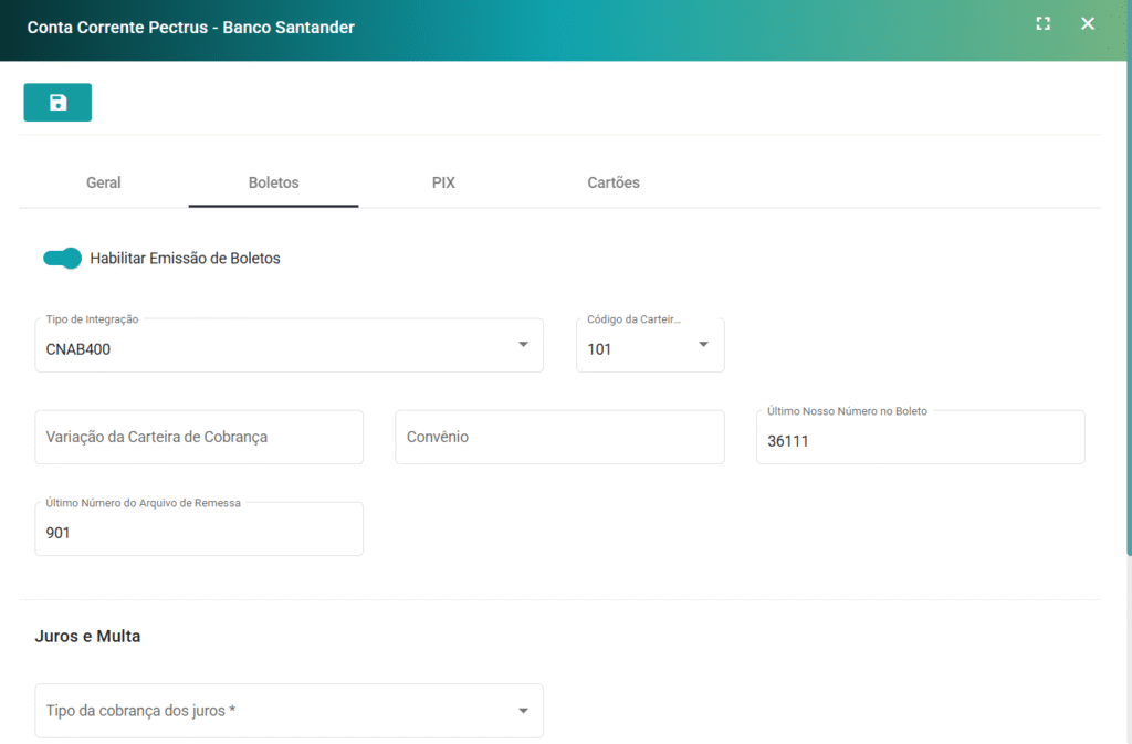 - Ativar Emissão de Boletos: Selecione está opção para que o sistema disponibilize a configuração dos boletos;