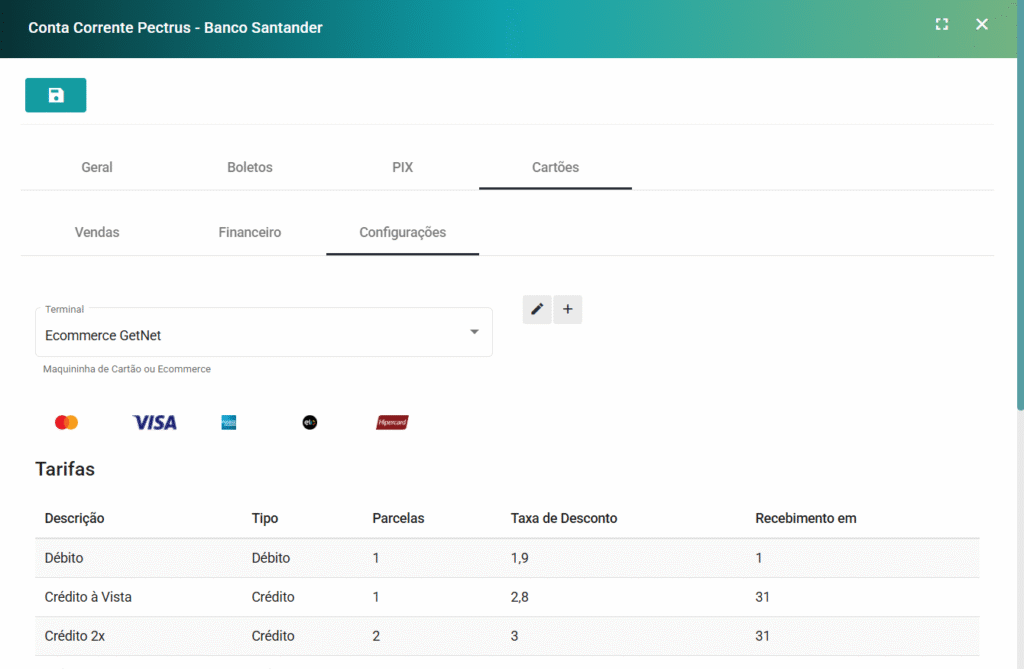 🔍 Para saber mais sobre Cadastro e Edição de Tarifas e Terminais de Cartão de Crédito, acesse: Cadastro/Edição de Tarifas e Terminais de Cartão de Crédito