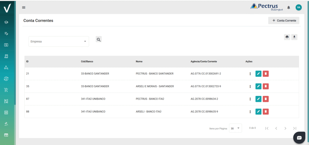 Agora, se deseja editar uma Conta Corrente já existente, clique no botão de lápis ao lado esquerdo da conta.