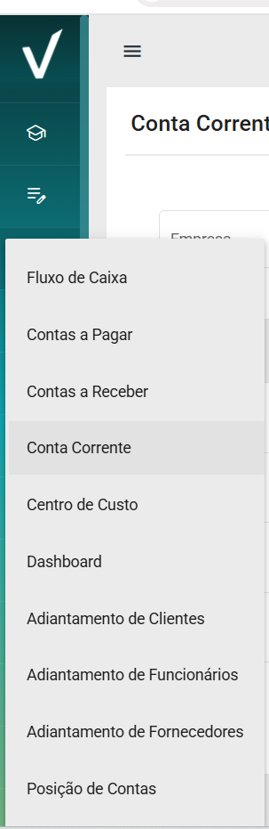 No menu superior a esquerda, acesse: Financeiro > Conta Corrente
