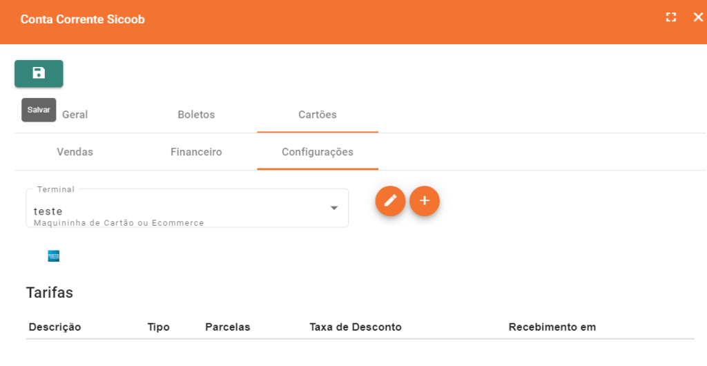 🔍 Para saber mais sobre essa aba de Configurações, acesse: Cadastro/Edição de Tarifas e Terminais de Cartão de Crédito
