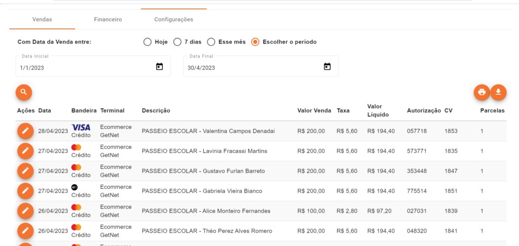 Nessa aba, é possível acompanhar todas as transações financeiras e suas respectivas datas com base nas vendas realizadas em seus terminais.