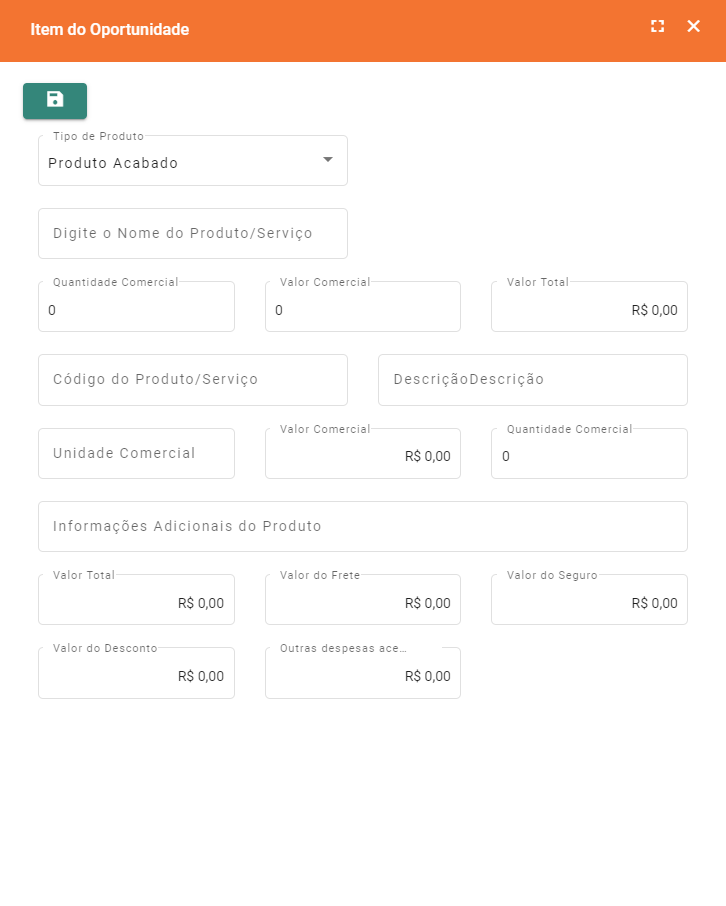 - Tipo de Produto: Selecione qual o tipo de produto/serviço será adicionado à Oportunidade, podendo ser um Produto Acabado, um Serviço, Uso e Consumo ou um Ativo Imobilizado;