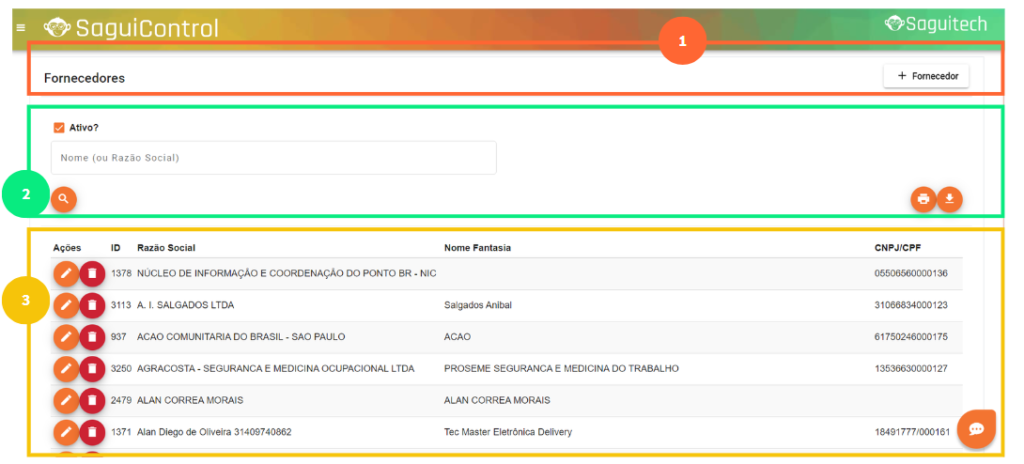 - A tela de Gestão de Fornecedores será aberta. Essa tela é composta por 3 principais seções: