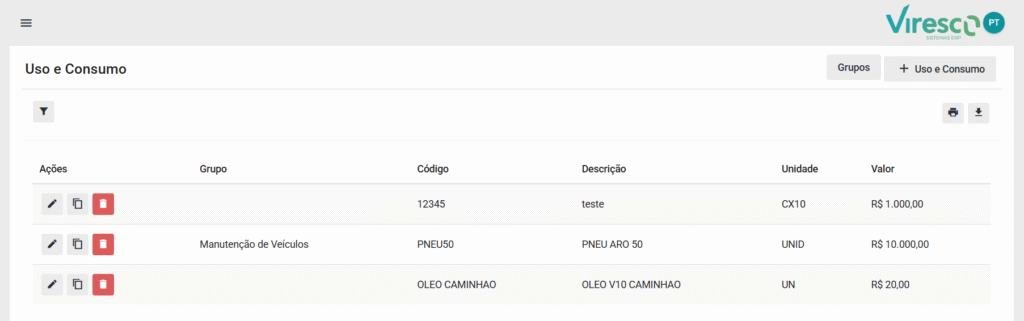 - A Tela de Gestão de Produtos de Uso e Consumo será aberta. Essa tela é composta por 2 principais seções: