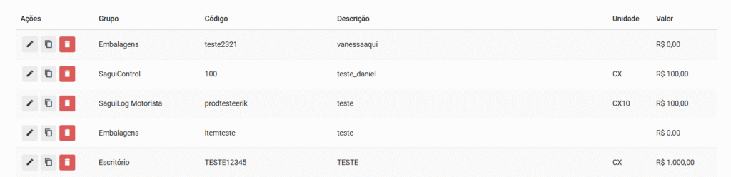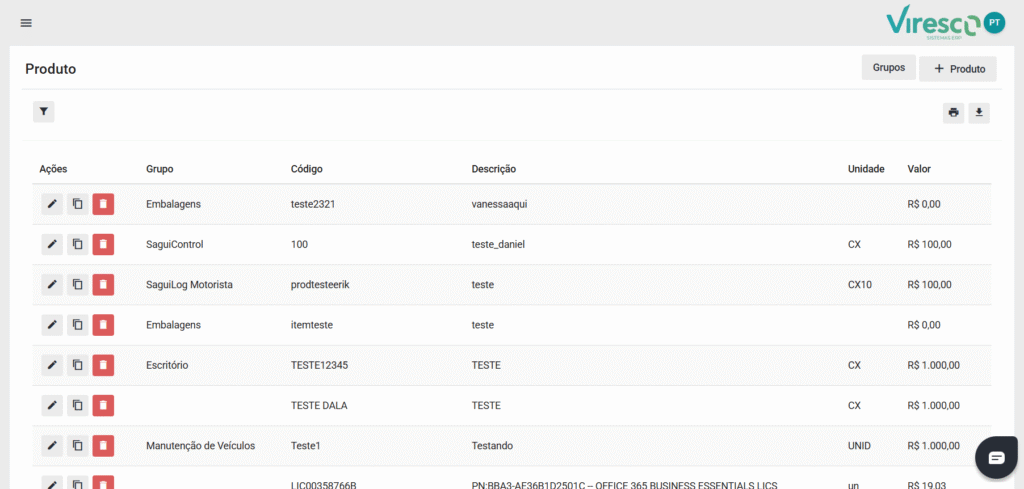 - Grupos: Coluna que exibe a categoria ou grupo ao qual o Produto pertence, facilitando a organização e a visualização de Produtos semelhantes;