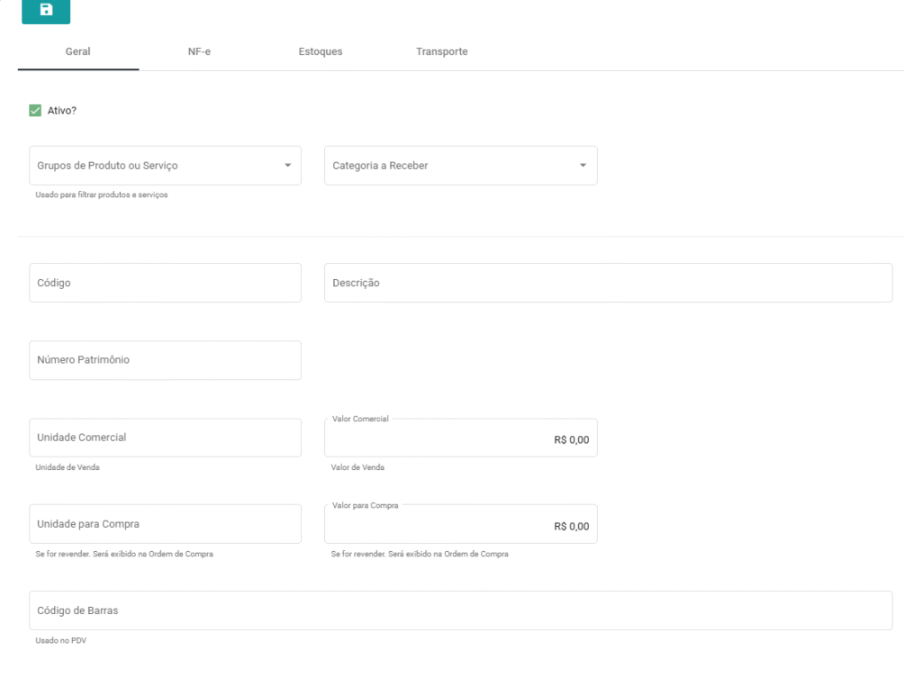 - Grupos de Produtos ou Serviço: Classifica o Ativo em um grupo específico de produtos ou serviços, facilitando a organização e a gestão dos Ativos Imobilizados;