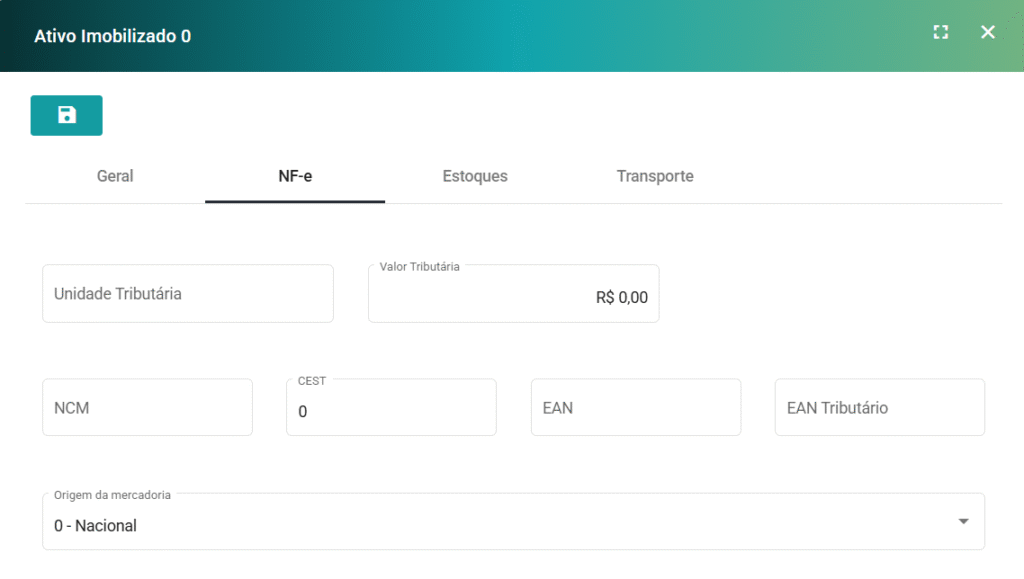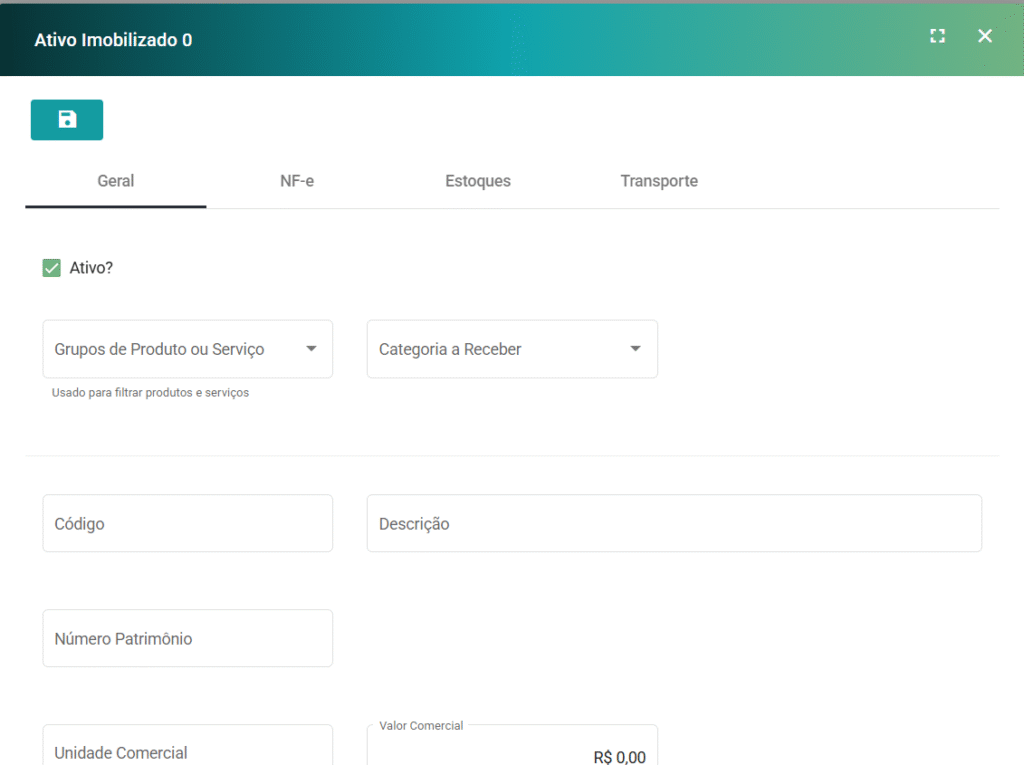 , no canto superior esquerdo da janela, assim o cadastro ou edição do Ativo ficará Salvo no Sistema.