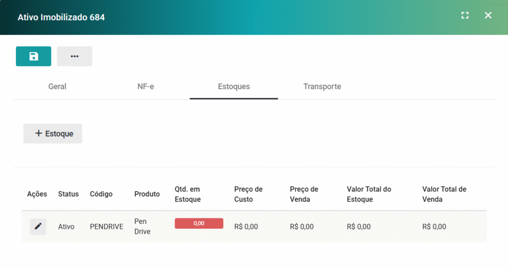 Esta aba permitirá que você crie um novo Estoque ou edite um existente.