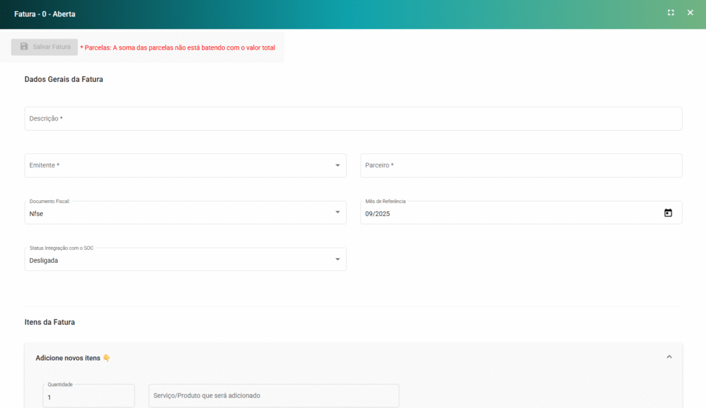 - Quantidade: Defina a quantidade do item que será incluso à Fatura;