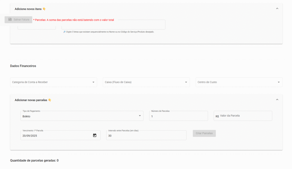 - Número de Parcelas: Defina o número de Parcelas que a Fatura terá;