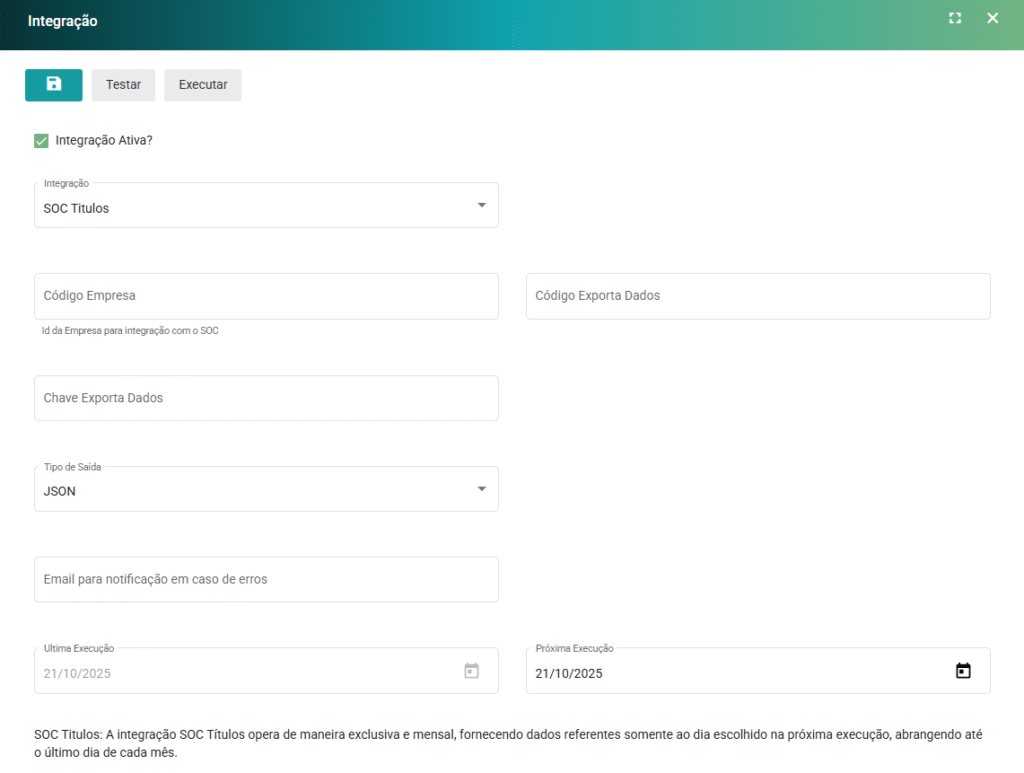 A integração SOC Títulos opera exclusivamente de forma mensal, fornecendo dados referentes ao dia escolhido na próxima execução, abrangendo até o último dia do mês anterior.