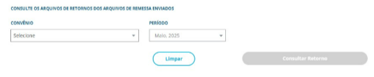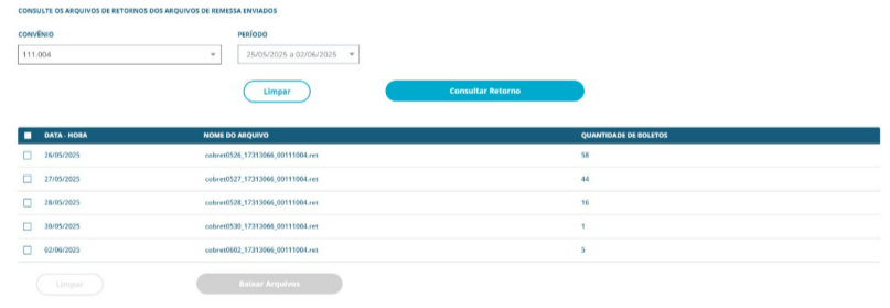 Na mesma tela usada para envio de remessas, role a página até a seção: “Consulte os Arquivos de Retornos dos Arquivos de Remessa Enviados”