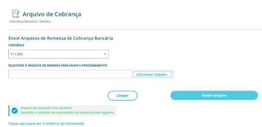 ✅ “Arquivo processado com sucesso! Consulte o relatório do movimento da cobrança com registro.”