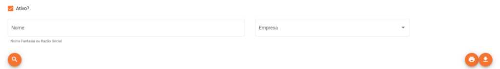 - O ícone representado por uma lupa é o botão utilizado para iniciar o processo de busca. Após aplicar os filtros desejados, como a seleção do filtro “Ativo” e o preenchimento do campo “Nome”, basta clicar neste botão para iniciar a busca.