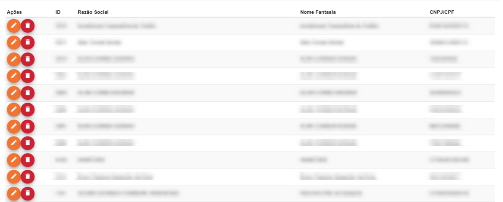 Todos os clientes que correspondem aos critérios de busca definidos anteriormente serão apresentados nesta tabela. Por exemplo, se a opção “Ativo” estiver selecionada e o campo “Nome” estiver em branco ao realizar a busca, todos os clientes ativos serão listados nesta tabela.