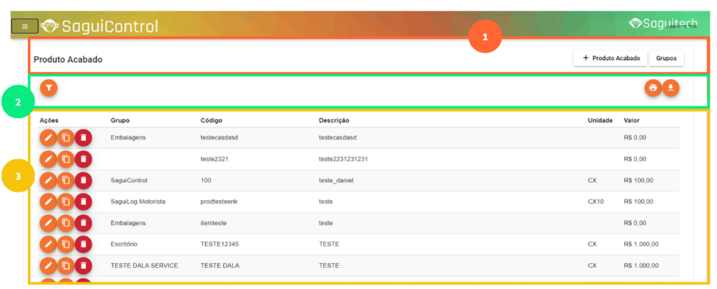 A barra de ações é composta pelas principais ações que podem ser feitas dentro da Gestão de Produtos