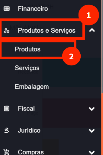 No menu superior a esquerda, acesse Produtos e Serviços > Produtos